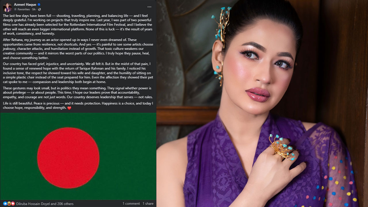 ক্যারিয়ারের নানা ব্যস্ততার পাশাপাশি দেশের সমসাময়িক ইস্যু নিয়ে সরব থাকেন অভিনেত্রী আজমেরী হক বাঁধন। শুক্রবার (২৬ ডিসেম্বর) এক দীর্ঘ ফেসবুক পোস্ট দেন অভিনেত্রী; যেখানে বিএনপির ভারপ্রাপ্ত চেয়ারম্যান তারেক রহমানের প্রত্যাবর্তন ও দেশের ভবিষ্যৎ নেতৃত্ব নিয়ে নিজের ভাবনা প্রকাশ করেছেন তিনি।
