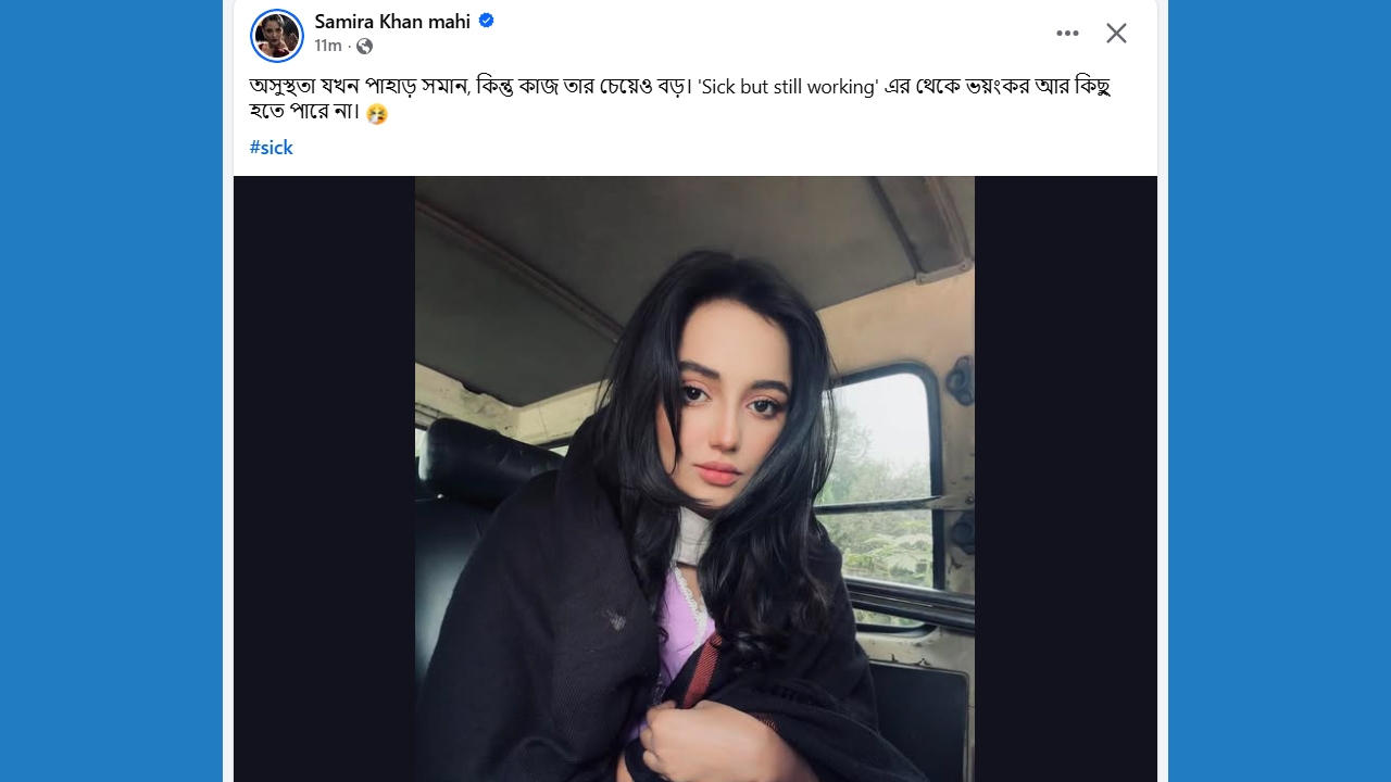 মাহি লিখেছেন, ‘অসুস্থতা যখন পাহাড় সমান, কিন্তু কাজ তার চেয়েও বড়। অসুস্থ থাকলেও কাজ করে যাচ্ছি; এর থেকে ভয়ংকর আর কিছু হতে পারে না।’