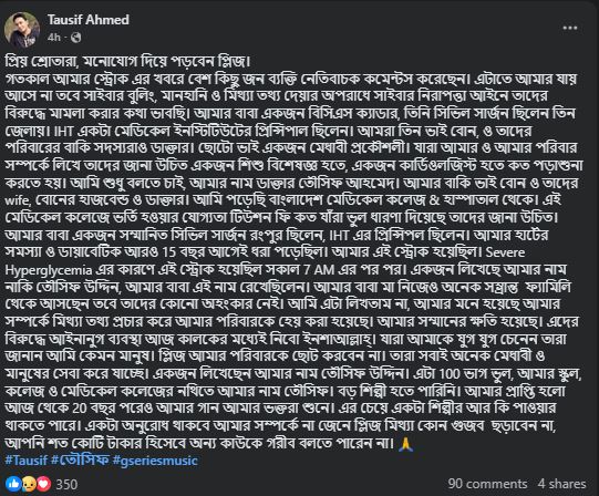 তৌসিফ তার পোস্টে জানান, তার নাম ও পারিবারিক পরিচয় নিয়ে ভুল তথ্য ছড়ানোয় তিনি মর্মাহত। লেখেন, আমার বাবা একজন বিসিএস ক্যাডার, তিনি তিন জেলায় সিভিল সার্জন ছিলেন। আমরা তিন ভাই-বোন এবং আমাদের পরিবারের বাকি সদস্যরাও ডাক্তার। ছোট ভাই একজন মেধাবী প্রকৌশলী। যারা আমার ও আমার পরিবার সম্পর্কে লেখে, তাদের জানা উচিত একজন শিশু বিশেষজ্ঞ হতে বা একজন কার্ডিওলজিস্ট হতে কত পড়াশোনা করতে হয়।