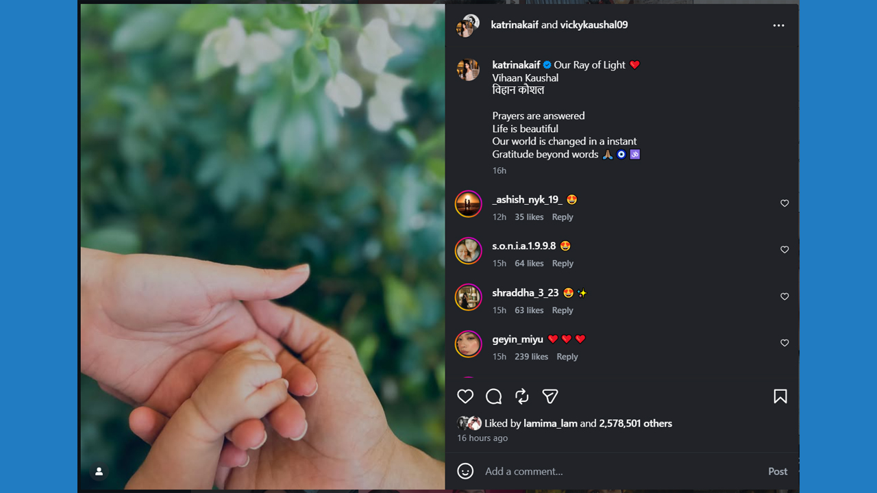 ক্যাটরিনার পোস্টে ভালোবাসায় ভরিয়েছেন সেলিব্রিটিরাও। পরিণীতি চোপড়া লিখেছেন, ‘ছোট্ট বেবি, অনেক ভালোবাসা।’ দিয়া মির্জা থেকে শুরু করে ভূমি পেডনেকার, হৃতিক রোশান, অদিতি রাও হায়দারি সকলেই বিহানকে ভালোবাসায় ভরিয়েছেন।