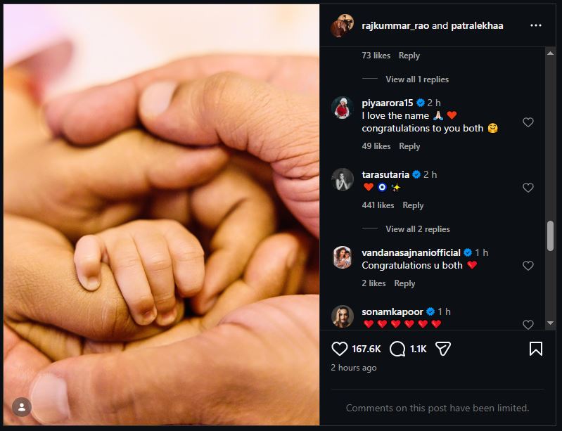 ২০২৫ সালের ১৫ নভেম্বর রাজকুমার রাও ও পত্রলেখার কোলজুড়ে আসে তাদের প্রথম সন্তান। কাকতালীয়ভাবে সেই দিনটি ছিল এই দম্পতির চতুর্থ বিবাহবার্ষিকী। তবে এতদিন তারা সন্তানের নাম বা ছবি সামনে আনেননি। তার দুই মাস পর ভক্তদের এবার চমকে দিলেন তারা।