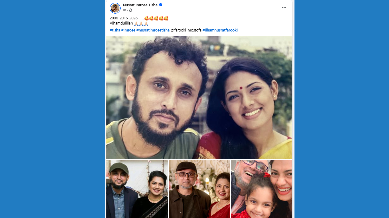 ক্যাপশনে তিশা খুব সংক্ষেপে কিন্তু গভীর কৃতজ্ঞতায় লিখেছেন, ‘২০০৬-২০১৬-২০২৬, আলহামদুলিল্লাহ্।’ মাত্র তিনটি সাল এবং এক শব্দের এই ক্যাপশনে যেন ফুটে উঠেছে একটি দীর্ঘ সম্পর্কের সফল পরিণাম ও নির্ভরতার গল্প।