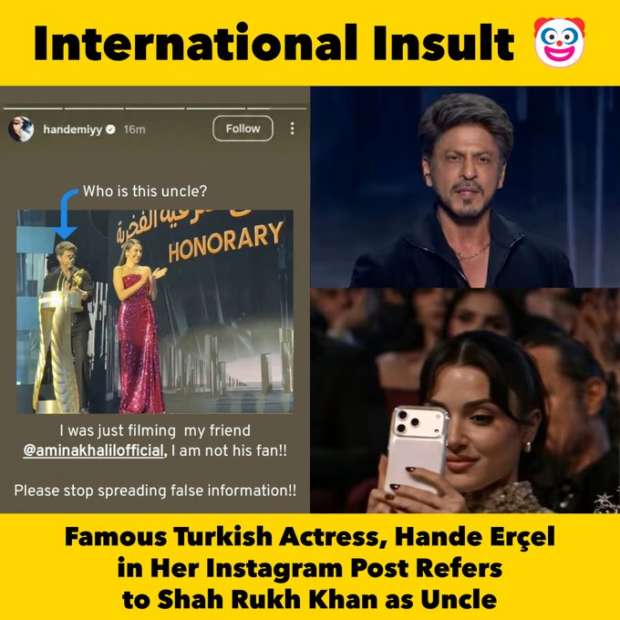 সম্প্রতি সৌদি আরবের রিয়াদে এক জমকালো পুরস্কার অনুষ্ঠানে মিশরীয় অভিনেত্রী আমিনা খলিলের সঙ্গে মঞ্চে দেখা যায় শাহরুখ খানকে। সেই মুহূর্তটি দর্শকাসনে বসে ভিডিও করছিলেন হান্দে এরচেল।