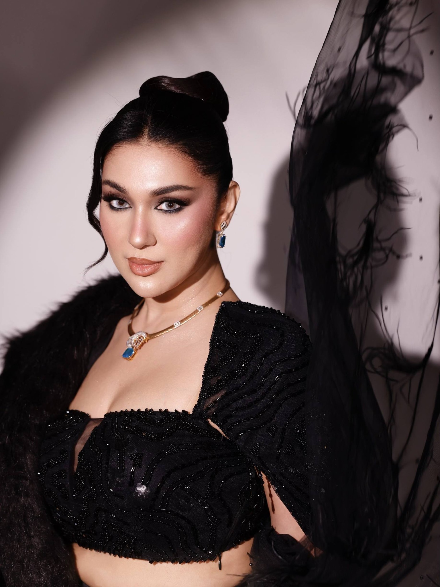 কালো রঙের আধুনিক কাটের ব্লাউজ ও লম্বা স্কার্টে নিজেকে উপস্থাপন করেছেন অপু বিশ্বাস। পোশাকের সঙ্গে যুক্ত রয়েছে এক পাশ থেকে ঝুলে থাকা স্বচ্ছ কালো ওড়না, যা বাতাসে ভেসে ছবিটিতে নাটকীয়তা ও আভিজাত্যের ছোঁয়া এনেছে।