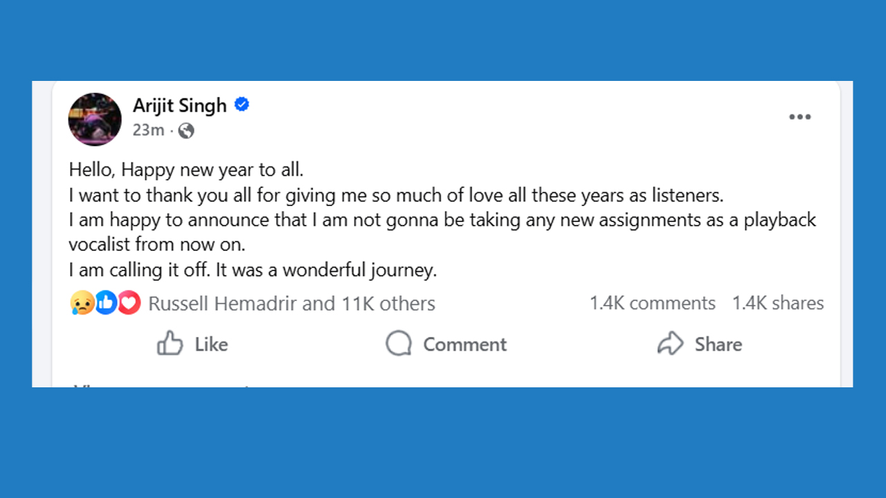 তবে সংগীত অনুরাগীদের জন্য এবার বড় এক দুঃসংবাদ দিলেন ভারতের জনপ্রিয় কণ্ঠশিল্পী অরিজিৎ সিং। আর কোনো নতুন সিনেমার গানে (প্লেব্যাক) কণ্ঠ দেবেন না বলে ঘোষণা দিয়েছেন তিনি।
