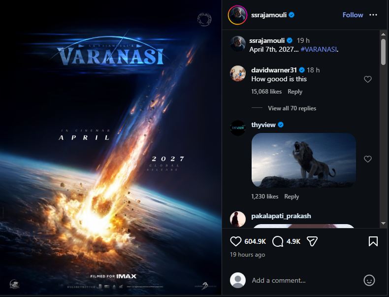 সিনেমার পোস্টারে দেখা যায়, পৃথিবীর বুকে বিশাল সব পাথর আছড়ে পড়ছে। পোস্টারের ক্যাপশনে নির্মাতা লিখেছেন, ‘৭ এপ্রিল, ২০২৭... #VARANASI’। অর্থাৎ ২০২৭ সালের ৭ এপ্রিল বিশ্বজুড়ে প্রেক্ষাগৃহে মুক্তি পাবে বিগ বাজেটের এই সিনেমাটি। জানা গেছে, সিনেমাটি মূলত একটি ‘গ্লোবাল ট্রটার’ বা বিশ্বভ্রমণ ভিত্তিক অ্যাডভেঞ্চার ঘরানার গল্প হবে।