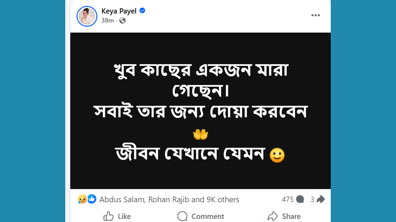 ফেসবুকে দেওয়া ওই পোস্টে কেয়া পায়েল লিখেছেন, ‘খুব কাছের একজন মারা গেছেন। সবাই তার জন্য দোয়া করবেন, জীবন যেখানে যেমন।’