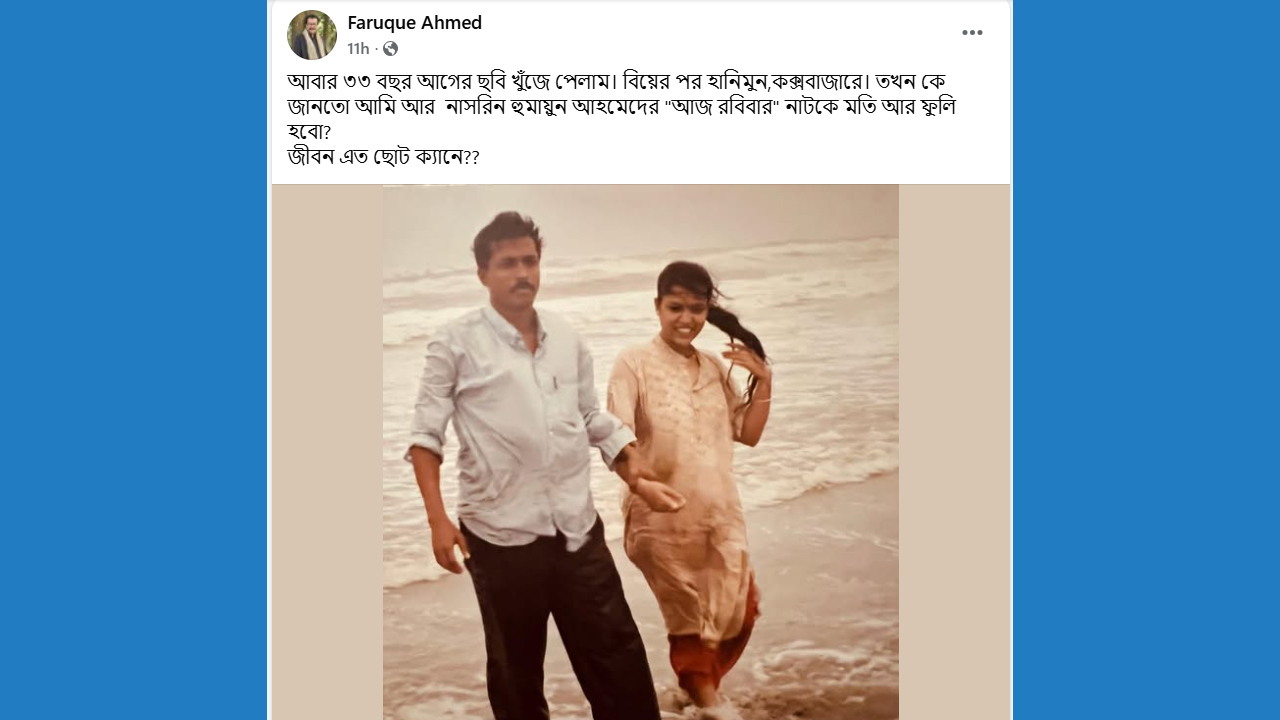 স্মৃতির পাতায় ডুব দিয়ে ফারুক আহমেদ আরও লেখেন, ‘তখন কে জানতো আমি আর নাসরিন হুমায়ূন আহমেদের ‘আজ রবিবার’ নাটকে মতি আর ফুলি হবো? জীবন এত ছোট ক্যানে?’