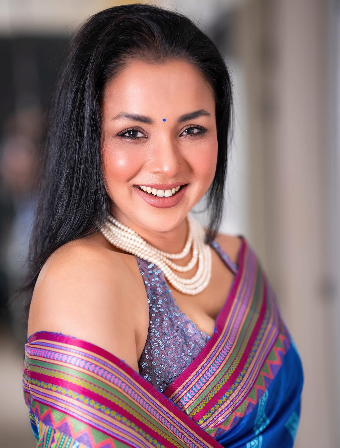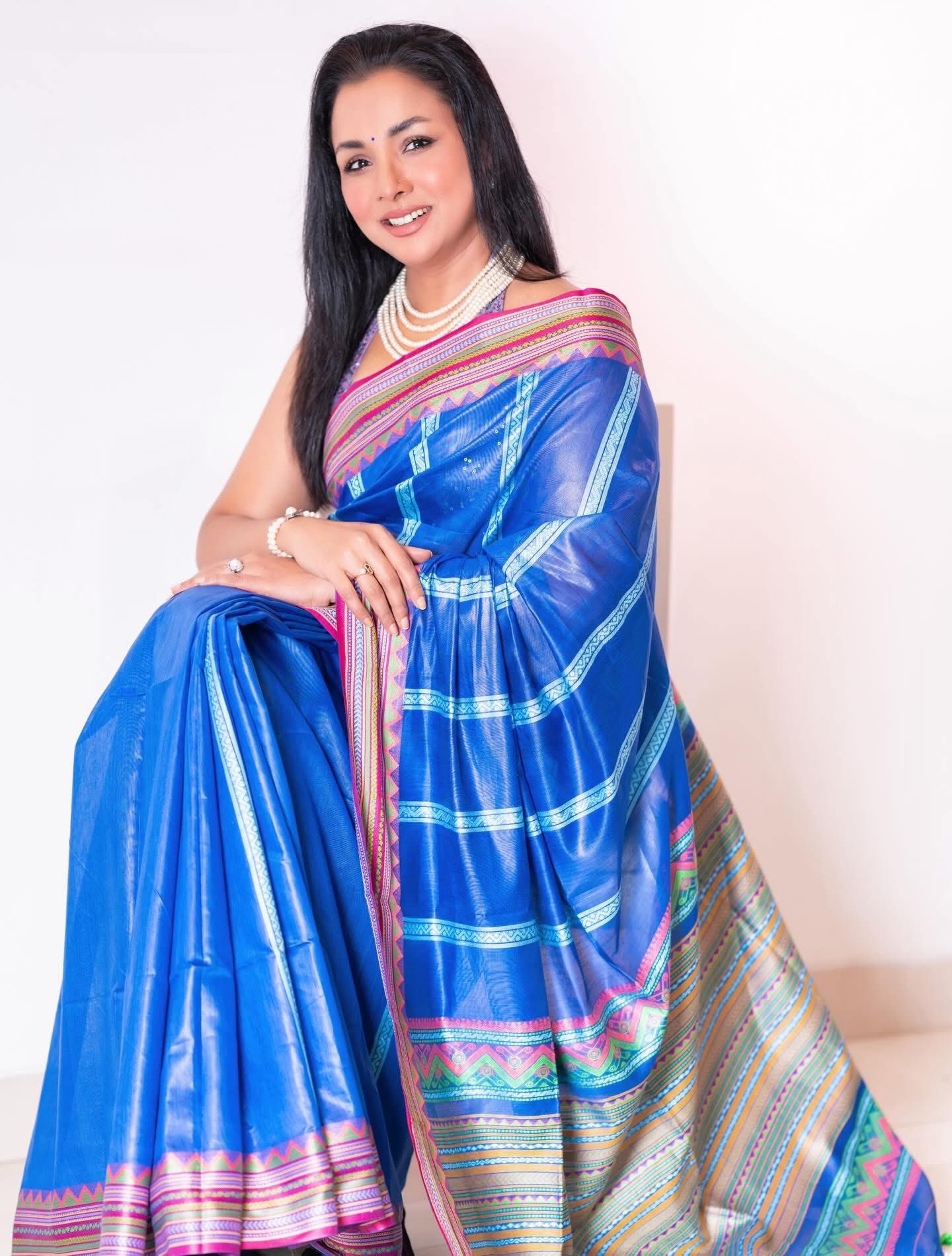 ছবিতে রুনা খানকে দেখা গেছে অত্যন্ত আধুনিক ও আভিজাত্যপূর্ণ লুকে। পরেছেন নীল ও বেগুনি রঙের একটি জমকালো শাড়ি, ম্যাচিং স্লিভলেস সিকুইন ব্লাউজ; যা তাকে দিয়েছে এক অনন্য মাত্রা।