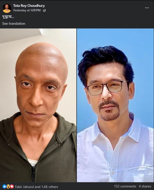 ফেসবুকে দুটি ছবি কোলাজ করে একটি পোস্ট করেন টোটা। সেখানে তার দুটি ভিন্ন রূপ দেখা যাচ্ছে। একপাশে তিনি চিরচেনা লুকে একমাথা চুল, ফ্রেঞ্চ কাট দাড়ি ও চোখে চশমা। অন্য পাশের ছবিটিতে তিনি সম্পূর্ণ টেকো বা টাক মাথায় হাজির হয়েছেন। ছবির ক্যাপশনে অভিনেতা লিখেছেন শুধু একটি শব্দ ‘দু মুখো’।