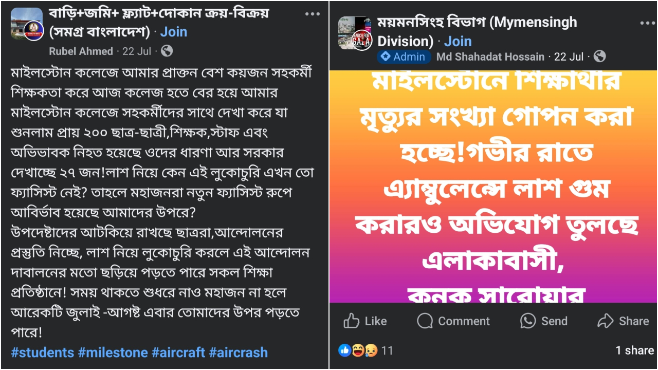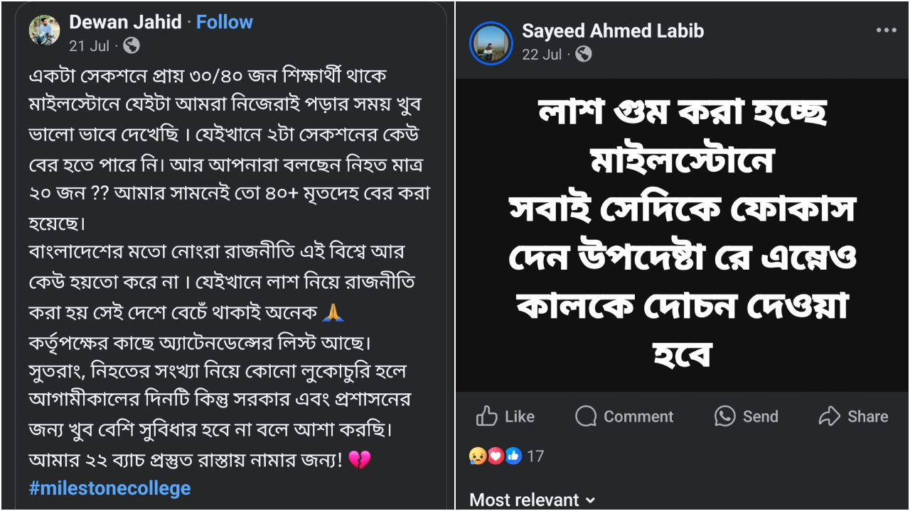 ২২ জুলাই রুবেল আহমেদ নামে একজন একটি ফেসবুক গ্রুপে লেখেন, মাইলস্টোন কলেজে আমার প্রাক্তন সহকর্মী কয়েকজন শিক্ষক আছেন। আজ কলেজে গিয়ে তাদের সঙ্গে দেখা করে শুনলাম- প্রায় ২০০ ছাত্র-ছাত্রী, শিক্ষক, স্টাফ এবং অভিভাবক নিহত হয়েছেন। আর সরকার দেখাচ্ছে মাত্র ২৭ জন! লাশ নিয়ে কেন এই লুকোচুরি? উপদেষ্টাদের আটকে রাখছে ছাত্ররা, আন্দোলনের প্রস্তুতি নিচ্ছে। সময় থাকতে শুধরে নাও, না হলে দাবালনের মতো ছড়িয়ে পড়বে।