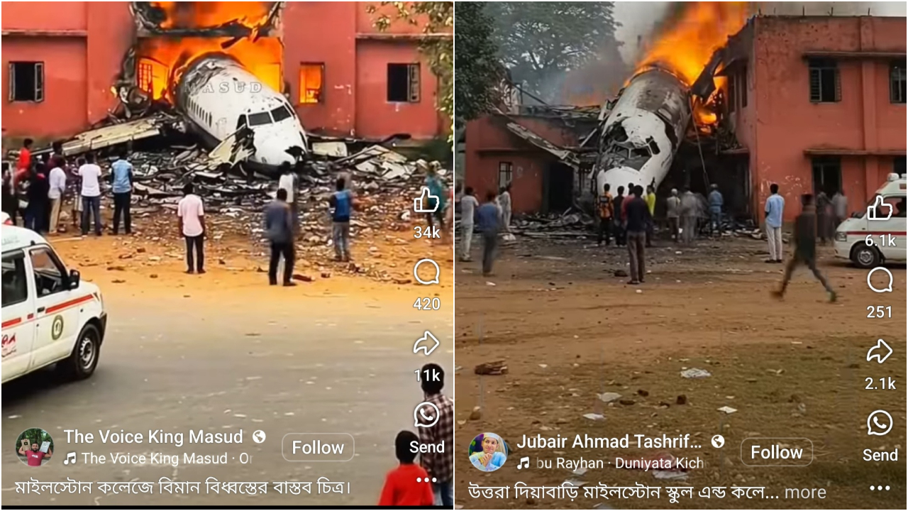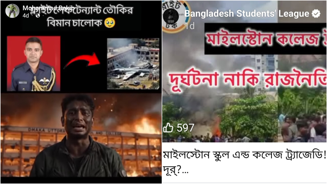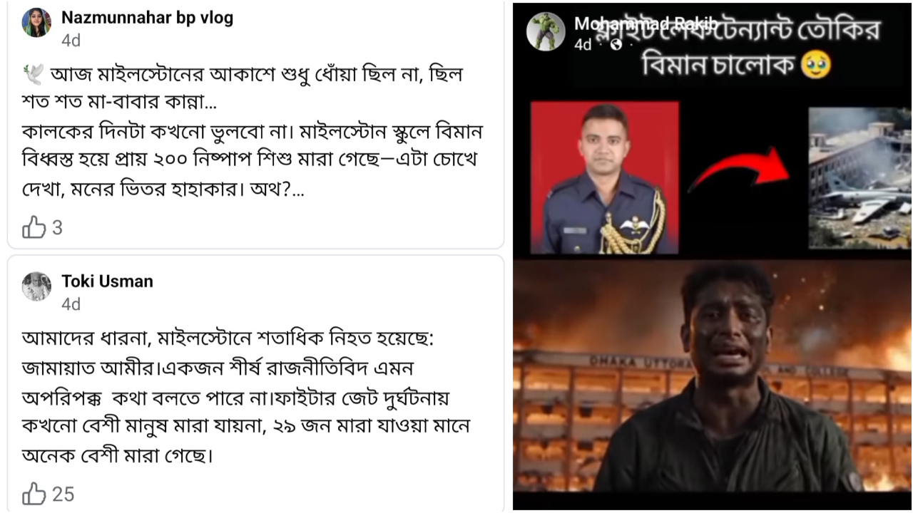 বিশ্লেষণে দেখা গেছে, দুর্ঘটনার প্রথম ২৪ ঘণ্টায় ফেসবুকে অন্তত এক ডজনের বেশি ‘সংবেদনশীল’ পোস্ট ভাইরাল হয়। এসব পোস্টে এআই-নির্মিত ফেইক ছবি, পাইলটের মৃতদেহ ও শেষ কথোপকথন, শিক্ষার্থীদের মারধরের খবর এবং কলেজ কর্তৃপক্ষ সত্য গোপন করছে- এমন গুজব ছড়ানো হয়। অথচ তখন সরকারি কোনো কর্তৃপক্ষের পক্ষ থেকে তাৎক্ষণিক কোনো প্রতিক্রিয়া আসেনি।
