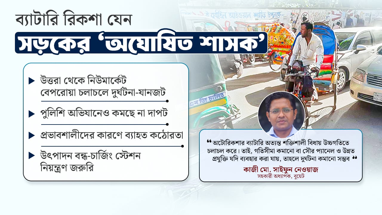 বিশেষজ্ঞরা আরও বলেন, যাত্রীদের সস্তা ও সহজলভ্য সেবা দেওয়ার কথা বলে ব্যাটারিচালিত রিকশা অল্প সময়ে জনপ্রিয় হয়ে উঠলেও এর কোনো নিয়ন্ত্রণ কাঠামো নেই। ফলে চালকেরা নিয়ম না মেনে যেভাবে-সেভাবে গাড়ি চালাচ্ছেন। ফলে শুধু পথচারী নয়, প্রাইভেটকার থেকে শুরু করে বাসচালকেরাও আতঙ্কে থাকেন।