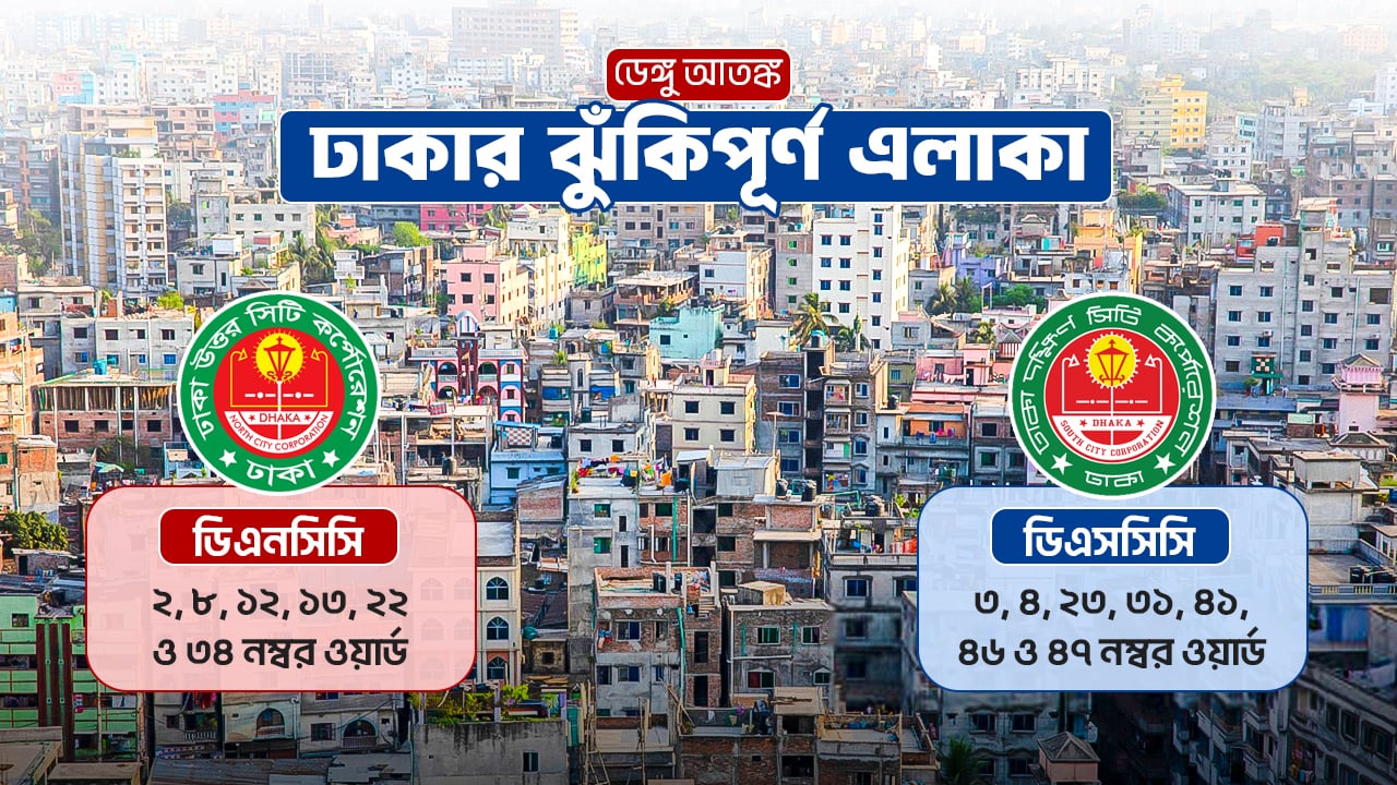 ঢাকা উত্তর সিটি কর্পোরেশনের ঝুঁকিপূর্ণ ওয়ার্ডগুলো হলো— ২, ৮, ১২, ১৩, ২২ ও ৩৪। আর ঢাকা দক্ষিণ সিটি কর্পোরেশনের ঝুঁকিতে থাকা ওয়ার্ডগুলো হলো— ৩, ৪, ২৩, ৩১, ৪১, ৪৬ ও ৪৭।