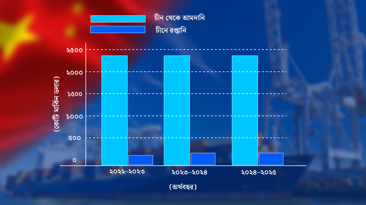 সর্বশেষ ২০২৪-২৫ অর্থবছরে ২ লাখ ৯১ হাজার ৬৬১ কোটি টাকা অর্থাৎ প্রায় ২ হাজার ৪২৮ কোটি মার্কিন ডলারের পণ্য আমদানি করেছে বাংলাদেশ। একই সময়ে চীনে রপ্তানি হয়েছে ৯ হাজার ১৫১ কোটি টাকা অর্থাৎ ৭৬ কোটি ডলারের পণ্য। সেক্ষেত্রে রপ্তানির তুলনায় বাংলাদেশে এই অর্থবছরে আমদানি বেশি ছিল ৩২ গুণ বেশি