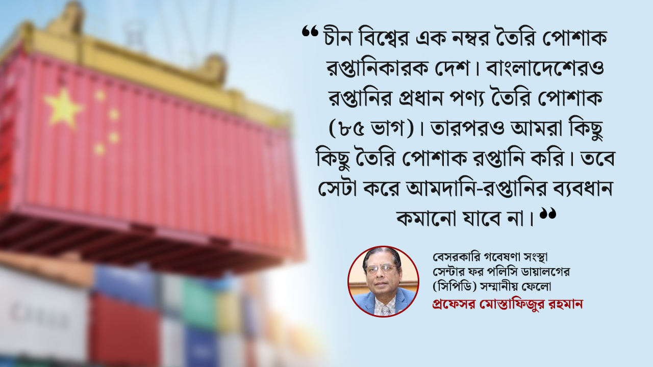 বেসরকারি গবেষণা সংস্থা সেন্টার ফর পলিসি ডায়ালগের (সিপিডি) সম্মাননীয় ফেলো প্রফেসর মোস্তাফিজুর রহমান ঢাকা পোস্টকে বলেন, ‘চীন বিশ্বের এক নম্বর তৈরি পোশাক রপ্তানিকারক দেশ। বাংলাদেশেরও রপ্তানির প্রধান পণ্য তৈরি পোশাক (৮৫ ভাগ)। তারপরও আমরা কিছু কিছু তৈরি পোশাক সেখানে রপ্তানি করি। তবে, সেটা করে আমদানি-রপ্তানির ব্যবধান কমানো যাবে না।’