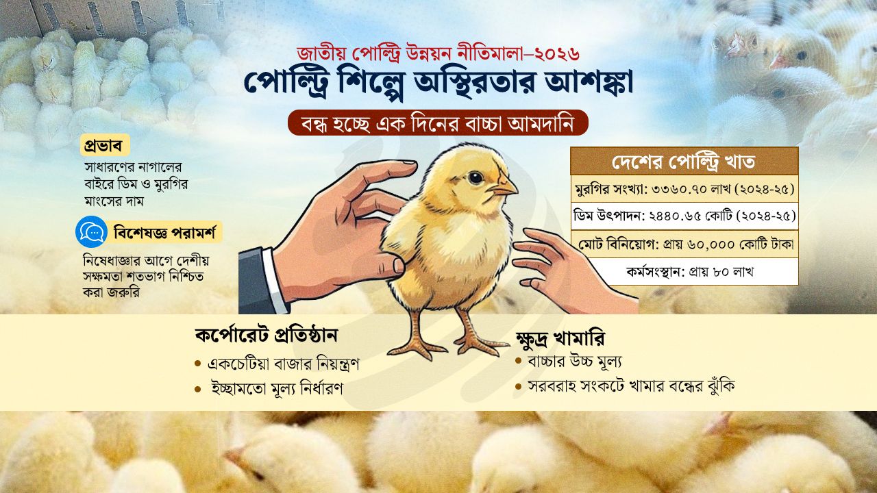 সক্ষমতা যাচাই না করেই এক দিনের মুরগির বাচ্চা আমদানি বন্ধের সিদ্ধান্ত নিতে যাচ্ছে সরকার। ‘জাতীয় পোল্ট্রি উন্নয়ন নীতিমালা–২০২৬’-এর চূড়ান্ত খসড়ায় বাণিজ্যিক পোল্ট্রি পালনের জন্য এক দিন বয়সী মুরগির বাচ্চা আমদানি নিষিদ্ধ করার প্রস্তাব রাখা হয়েছে। খাত-সংশ্লিষ্টদের আশঙ্কা, এই সিদ্ধান্ত বাস্তবায়িত হলে সবচেয়ে বেশি চাপে পড়বেন ক্ষুদ্র ও প্রান্তিক খামারিরা। একইসঙ্গে বাজারে গুটিকয়েক বড় কর্পোরেট প্রতিষ্ঠানের একচেটিয়া নিয়ন্ত্রণ ও সিন্ডিকেট তৈরির ঝুঁকি বাড়বে বলেও মনে করছেন তারা।