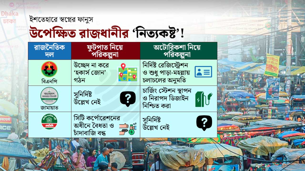 রাজধানীর যানজট বৃদ্ধি, সড়ক দুর্ঘটনা এবং পথচারীদের চরম ভোগান্তির পেছনে এই দুটি সমস্যার সরাসরি প্রভাব থাকলেও দলগুলোর ইশতেহারে এর কার্যকর কোনো সমাধান বা অঙ্গীকার প্রায় অনুপস্থিত।