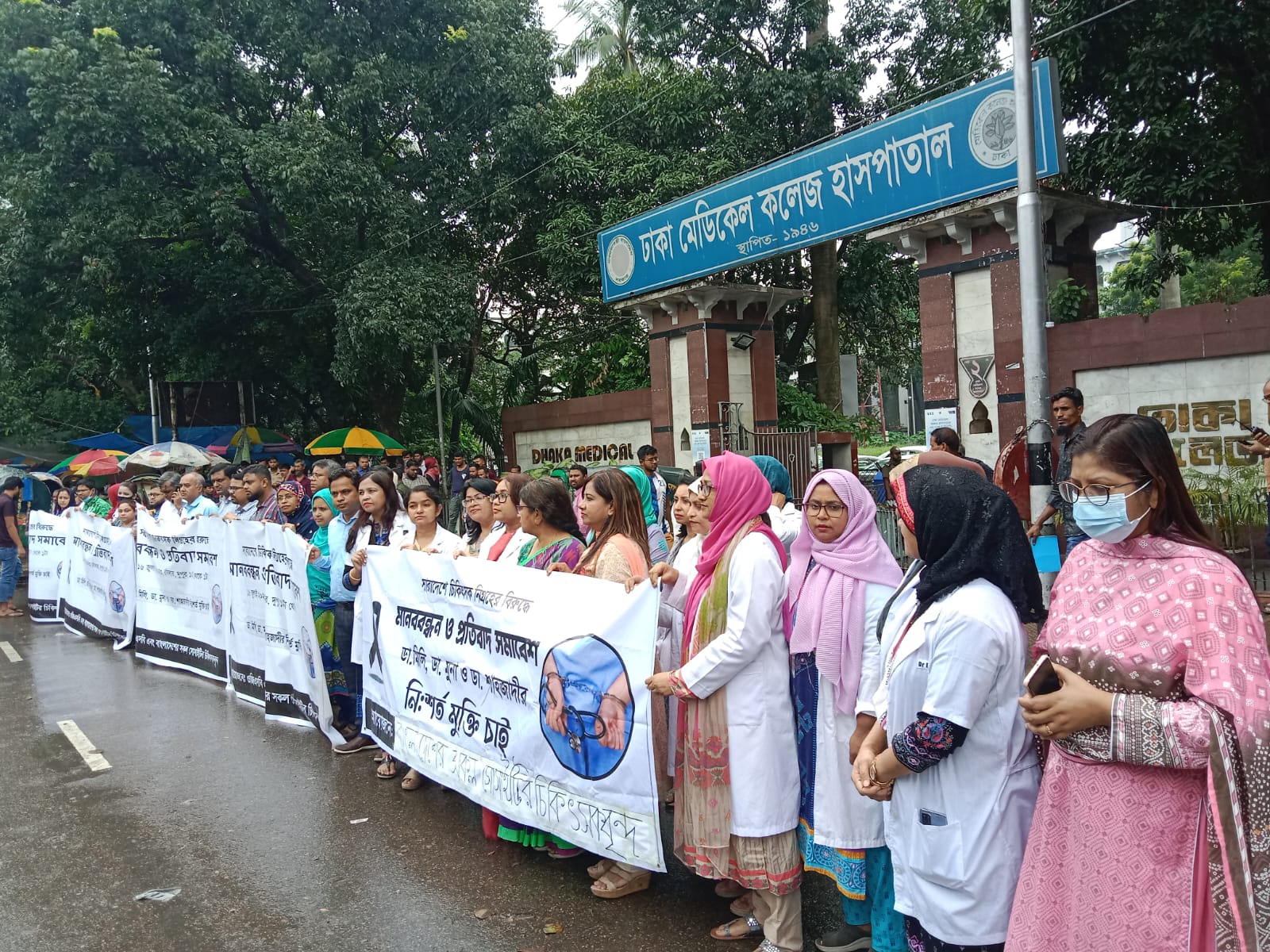 রোববার (১৬ জুলাই) দুপুরে ঢাকা মেডিকেল কলেজ (ঢামেক) হাসপাতালের বাগান গেটের সামনে এ মানববন্ধন ও প্রতিবাদ সমাবেশ অনুষ্ঠিত হয়।