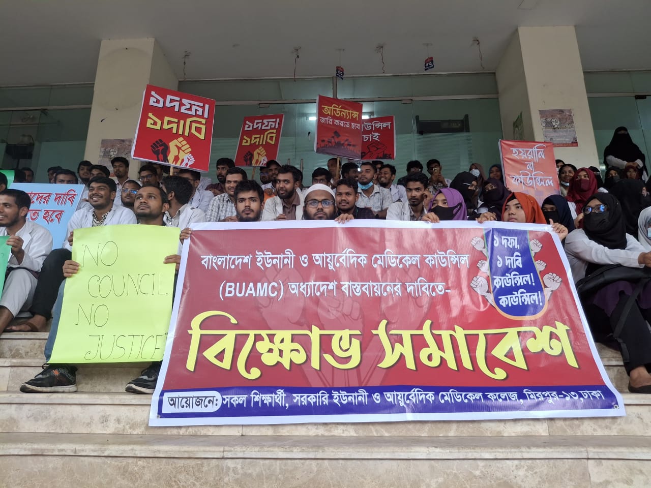 স্বতন্ত্র ইউনানী-আয়ুর্বেদিক কাউন্সিল গঠনের দাবিতে টানা তৃতীয় দিনের মতো আন্দোলনে রয়েছেন সরকারি ইউনানী ও আয়ুর্বেদিক মেডিকেল কলেজের শিক্ষার্থীরা।