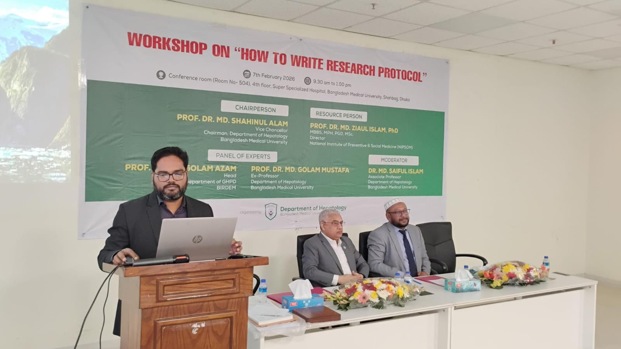 শনিবার (৭ ফেব্রুয়ারি) বাংলাদেশ মেডিকেল বিশ্ববিদ্যালয়ের (বিএমইউ) হেপাটোলজি বিভাগ আয়োজিত গবেষণা প্রোটোকল রচনায় দক্ষতা বৃদ্ধিমূলক ‘হাউ টু রাইট রিসার্চ প্রোটোকল’ শীর্ষক কর্মশালায় বক্তারা এসব কথা বলেন।