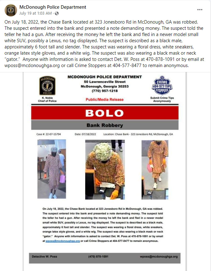 প্রতিবেদনে বলা হয়েছে, গত সোমবার (১৮ জুলাই) যুক্তরাষ্ট্রের জর্জিয়া অঙ্গরাজ্যের একটি ব্যাংকে ডাকাতির ওই ঘটনা ঘটে। পরে তদন্তে নেমে ব্যাংকের সিসিটিভি ফুটেজ উদ্ধার করে পুলিশ। আর এরপরই অভিযুক্তকে শনাক্ত করতে ওই ফুটেজ থেকে একটি ছবি ফেসবুকে শেয়ার করে মার্কিন পুলিশ।