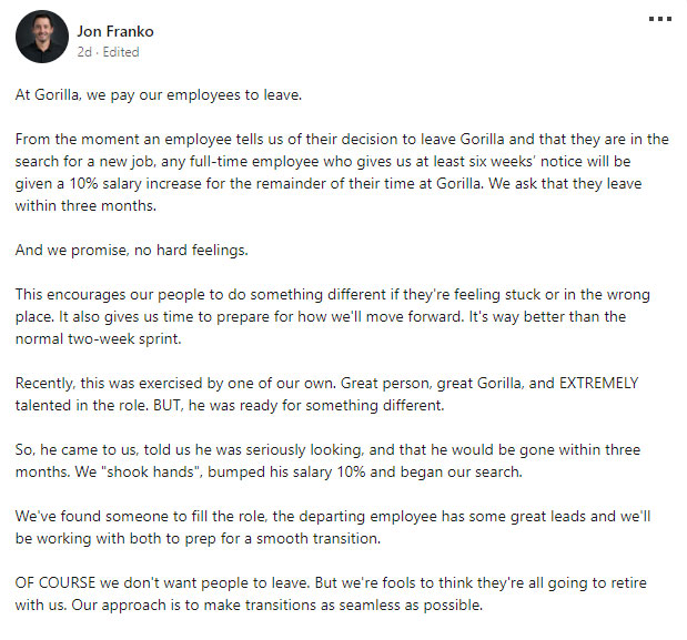 এনডিটিভি বলছে, ব্যতিক্রমী সিদ্ধান্ত নেওয়া যুক্তরাষ্ট্রের এই বিপণন প্রতিষ্ঠানের নাম গরিলা। লিংডইনে প্রকাশ করা এক বিবৃতিতে সংস্থাটির কর্ণধার জন ফ্রাংকো জানিয়েছেন, ওই সংস্থায় কর্মরত কেউ যদি চাকরি ছাড়ার সিদ্ধান্ত নেন, তাহলে সেই কর্মীর বেতন ১০ শতাংশ বাড়িয়ে দেওয়া হয়।