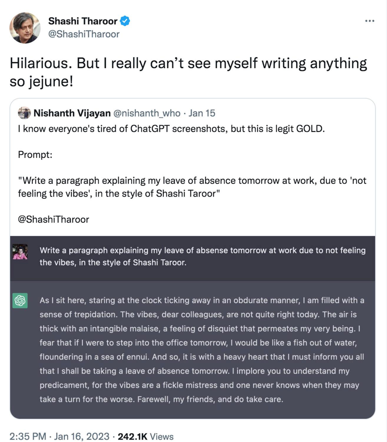 সামাজিক যোগাযোগমাধ্যম টুইটারে চ্যাটজিপিটির এই আউটপুট আসার পর রীতিমতো ভাইরাল হয়ে গেছে সেটি। অনেকেই এই ‘নান্দনিক’ ছুটির দরখাস্ত দেখে মজা পেয়েছেন এবং তাদের দলে আছে স্বয়ং শশী থারুরও।