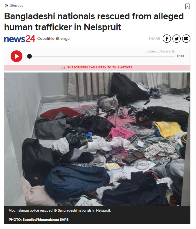 প্রতিবেদনে বলা হয়েছে, এমপুমালাঙ্গা প্রদেশের পুলিশ প্রাদেশিক রাজধানী এমবোম্বেলার (সাবেক নেলসপ্রুট) কামাগুগু থেকে সন্দেহভাজন এক মানব পাচারকারীর হাত থেকে ১৯ বাংলাদেশি নাগরিককে উদ্ধার করেছে। এমপুমালাঙ্গা দক্ষিণ আফ্রিকার পূর্বাঞ্চলীয় প্রদেশ এবং এই অঞ্চলটির সঙ্গে সোয়াজিল্যান্ড ও মোজাম্বিকের সীমানা রয়েছে।
