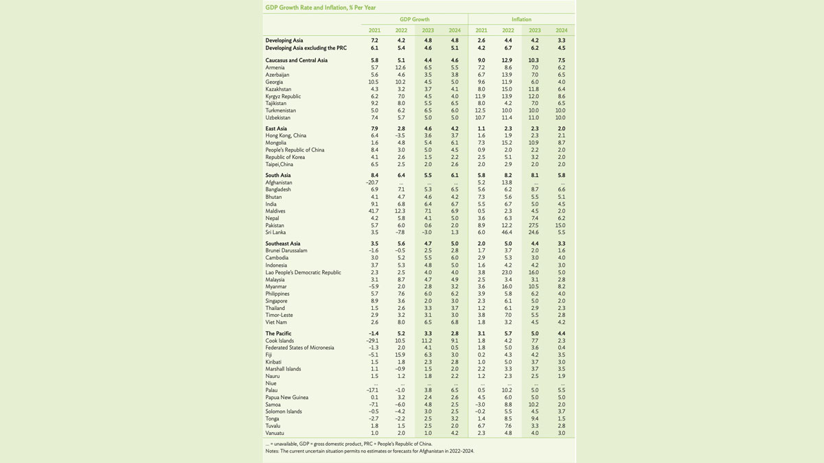 এডিপি বলেছে, ভোক্তার চাহিদা, পর্যটন এবং বিনিয়োগ বাড়ায় ২০২৩ সালে এশিয়ার জিডিপি প্রবৃদ্ধি বৃদ্ধি পাবে ৪ দশমিক ৮ শতাংশ। অপরদিকে ২০২৪ সালে প্রবৃদ্ধি ৪ দশমিক ২ শতাংশ বাড়বে।