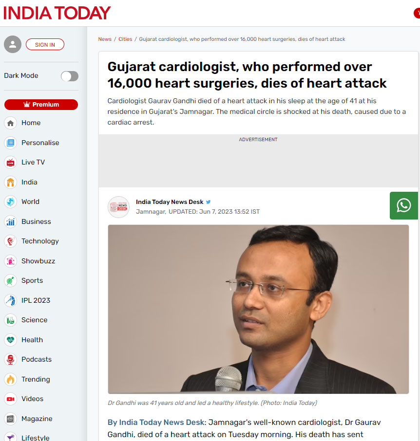 এনডিটিভি বলছে, গুজরাটের জামনগর শহরে ৪১ বছর বয়সী সুপরিচিত কার্ডিওলজিস্ট ডা. গৌরব গান্ধী হৃদরোগে আক্রান্ত হয়ে মারা গেছেন বলে বুধবার তার পরিবারের সদস্যরা এবং সহকর্মী জানিয়েছেন।