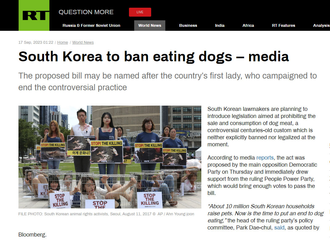আরটি বলছে, পার্ক তার দলের প্রধান নীতিনির্ধারক এবং তিনি ‘কিম কিওন-হি’স বিল’ শব্দটি ব্যবহার করেছেন, যেটি দেশের ফার্স্ট লেডিকে উল্লেখ করছে। দক্ষিণ কোরিয়ার এই ফার্স্ট লেডি তার দেশে কুকুরের মাংস খাওয়ার অনুশীলন বন্ধ করার জন্য প্রচারণা চালাচ্ছেন।
