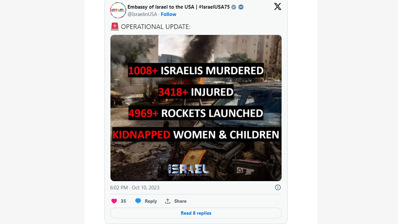 এতে বলা হয়েছে, ১ হাজার ৮ জন ইসরায়েলি হত্যার শিকার হয়েছেন। আহত হয়েছেন ৩ হাজার ৪১৮ জন। ইসরায়েলকে লক্ষ্য করে ছোড়া হয়েছে ৪ হাজার ৯৬৯টি রকেট। নারী ও শিশুদের জিম্মি করা হয়েছে।