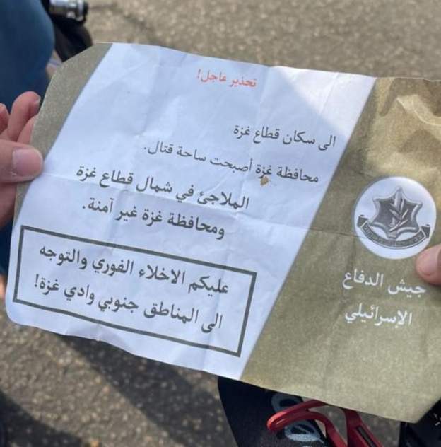 আরবি ভাষায় লেখা এ নির্দেশনায় সতর্কতা দিয়ে বলা হয়েছে, উত্তর গাজার অঞ্চলগুলো এখন ‘যুদ্ধক্ষেত্রে’ পরিণত হয়েছে; যেগুলো এখন নিরাপদ নয় এবং এখানকার বাসিন্দাদের দক্ষিণ দিকে সরে যাওয়া উচিত।