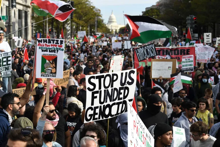 গাজায় ইসরায়েলি আগ্রাসন শুরু হওয়ার পর যুক্তরাষ্ট্রের রাজধানী ওয়াশিংটন ডিসিতে বিক্ষোভকারীরা শনিবার হোয়াইট হাউসের কাছে সবচেয়ে বড় বিক্ষোভ করেছে। এসময় কেউ কেউ ইসরায়েলের প্রতি প্রেসিডেন্ট জো বাইডেনের সমর্থনের সমালোচনাও করেন।