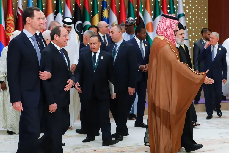অপর ছবিতে দেখা যাচ্ছে, মিসরের প্রেসিডেন্ট আব্দেল ফাত্তাহ এল-সিসি হাসছেন। তার সামনে দাঁড়িয়ে থাকা সৌদির ক্রাউন প্রিন্স কোনো এক নেতাকে হাত বাড়িয়ে সম্মেলন মঞ্চে গ্রহণ করে নিচ্ছেন।