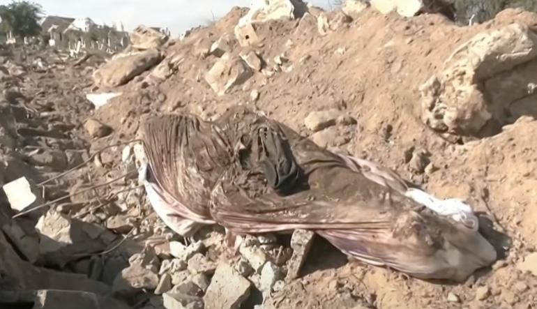 কাতারভিত্তিক সংবাদমাধ্যম আলজাজিরার প্রকাশিত একটি ছবিতে দেখা গেছে, সাদা কাফন পরানো একটি মরদেহ পড়ে আছে। ছবিটি দেখে বোঝা যাচ্ছে, মরদেহটি কয়েকদিন আগে সমাহিত করা হয়েছে।