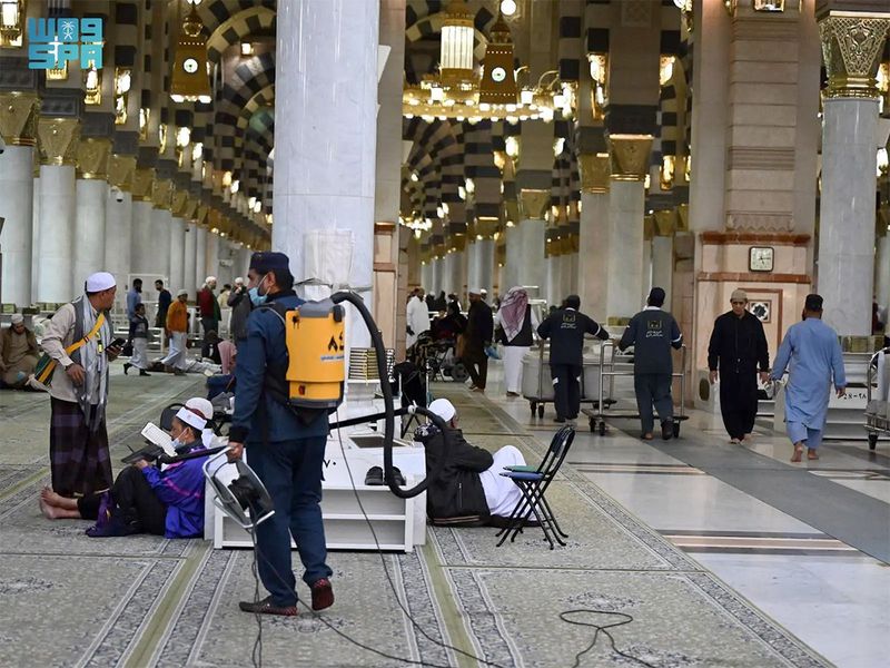 মসজিদের ১ হাজার ৩৭৮ মিলিয়ন স্কয়ার মিটারজুড়ে ধোয়া এবং জীবাণুমুক্তকরণের কাজ চলে।