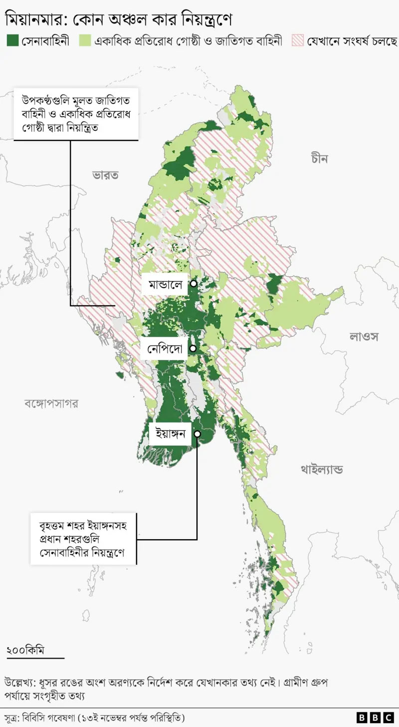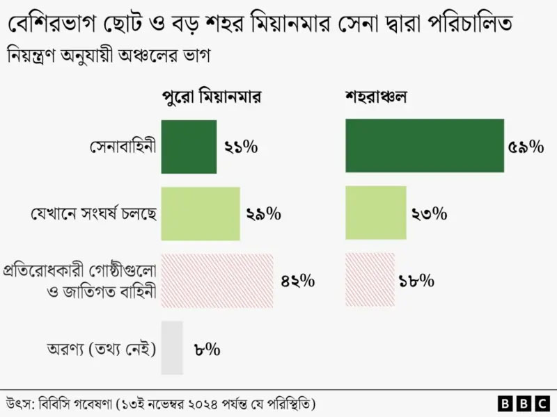 গত বছরের নভেম্বর মাসের মাঝামাঝি পর্যন্ত বিবিসি ১৪ হাজারেরও বেশি গ্রামীণ গ্রুপে ক্ষমতার ভারসাম্য পর্যালোচনা করে দেখেছে যে সংঘাত শুরু হওয়ার প্রায় চার বছর পর মিয়ানমারের মাত্র ২১ শতাংশ ভূখণ্ডের পূর্ণ নিয়ন্ত্রণ রয়েছে সেনাবাহিনীর হাতে।