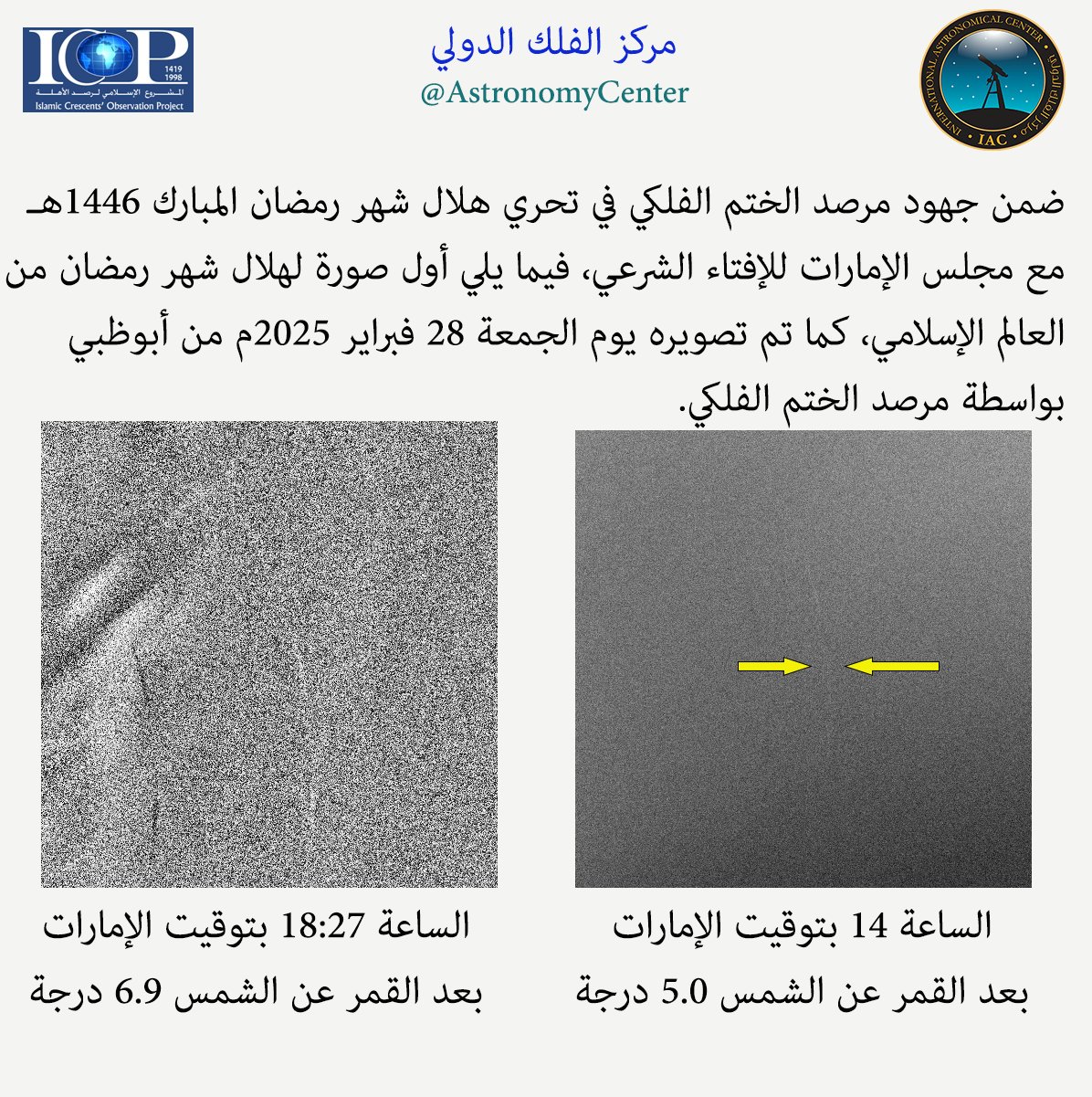 সংস্থাটি মাইক্রো ব্লগিং সাইট এক্সে একেটি পোস্টে জানিয়েছে, অনুসন্ধান চালানোর সময় তারা চাঁদটির ছবি তুলতে সমর্থ হয়। পোস্টে তারা বলেছে, “আমিরাত ফতোয়া কাউন্সিলের সঙ্গে, আল-খাতিম জ্যোতির্বিদ্যা পর্যবেক্ষক কেন্দ্রের দ্বারা ১৪৪৬ হিজরি সনের পবিত্র রমজানের চাঁদের অনুসন্ধানের সময় চাঁদটি দেখা যায়। এটি আরব বিশ্বের রমজান মাসের অর্ধচন্দ্রের ছবি। এই ছবিটি ২৮ ফেব্রুয়ারি আবুধাবি থেকে আল-খাতিম জ্যোতির্বিদ্যা পর্যবেক্ষক কেন্দ্র তোলে।”