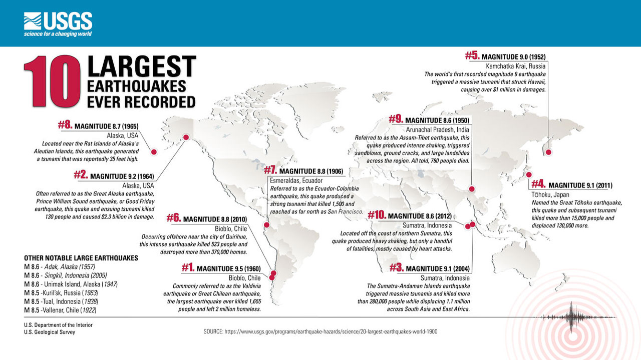 যুক্তরাষ্ট্রের ভূতত্ত্ব জরিপ সংস্থার ওয়েবসাইটে গত ১২৫ বছরের মধ্যে সবচেয়ে বিধ্বংসী ১০টি ভূমিকম্পের তালিকাও দেওয়া হয়েছে। সেই তালিকা পর্যালোচনা করে দেখা যাচ্ছে—