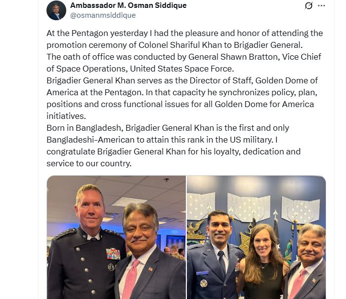 বর্তমানে ‘গোল্ডেন ডোম ফর আমেরিকার’ স্টাফ ডিরেক্টর পদে দায়িত্ব পালন করবেন ব্রিগেডিয়ার জেনারেল শরিফুল খান।