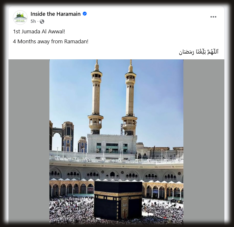 দুই পবিত্র মসজিদভিত্তিক ওয়েবসাইট ইনসাইড দ্য হারামাইন আজ একটি পোস্টে বলেছে, “জমাদিউল আওয়াল মাসের প্রথমদিন! রমজান থেকে আর চার মাস দূরে!”