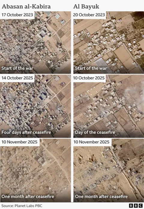 তবে বিবিসির হাতে থাকা স্যাটেলাইট ইমেজগুলো বলছে, ১০ অক্টোবর যুদ্ধবিরতি শুরুর পর থেকে এখন পর্যন্ত পুরো দমে হামলা চালিয়ে ভবন ও অকাঠামো ধ্বংস করা অব্যাহত রেখেছে আইডিএফ।