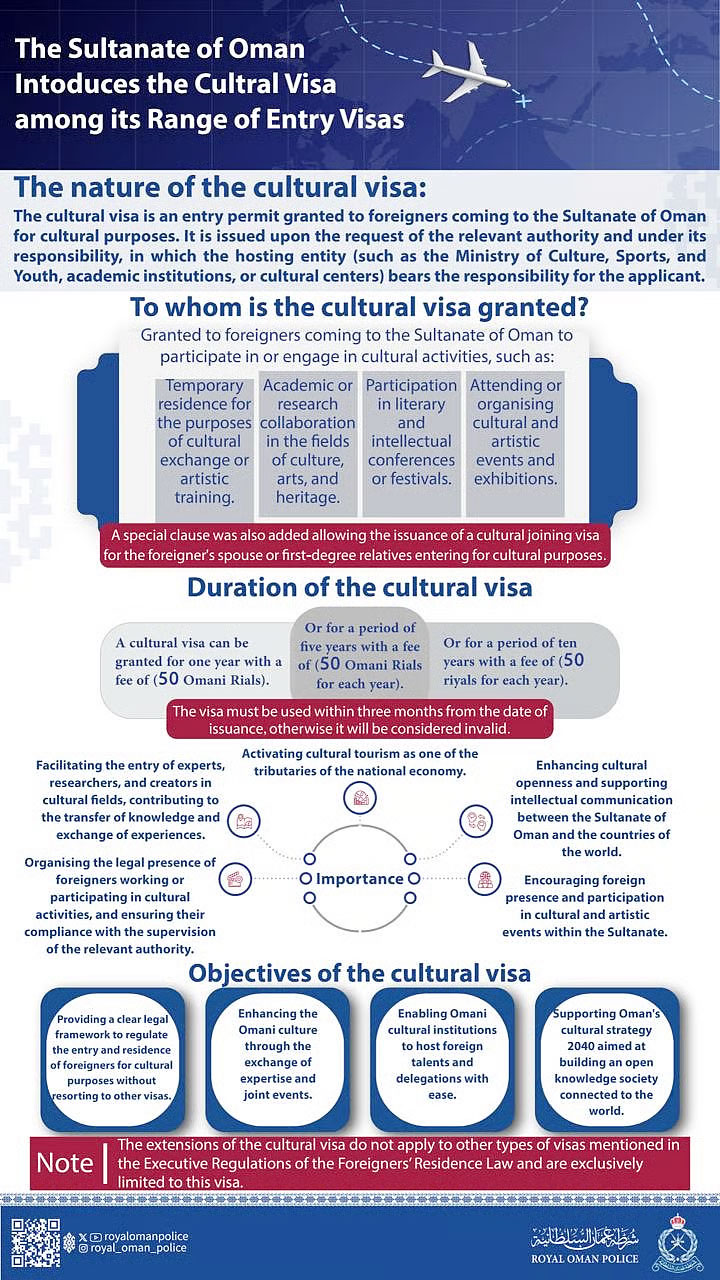 বিশ্বের বিভিন্ন দেশের মেধাবীদের জন্য ‘কালচারাল ভিসা’ নামে নতুন একটি ভিসা প্রকল্প চালু করেছে মধ্যপ্রাচ্যের উপসাগরীয় অঞ্চলের দেশ ওমান। নতুন এই ভিসা প্রকল্পের প্রধান উদ্দেশ্য দেশটির শিল্প ও সংস্কৃতি খাতে বিশ্বের বিভিন্ন দেশের শিল্পী, গবেষক ও সাংস্কৃতিক ব্যক্তিদের আকৃষ্ট করা।