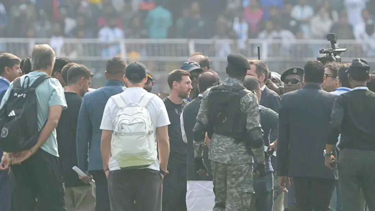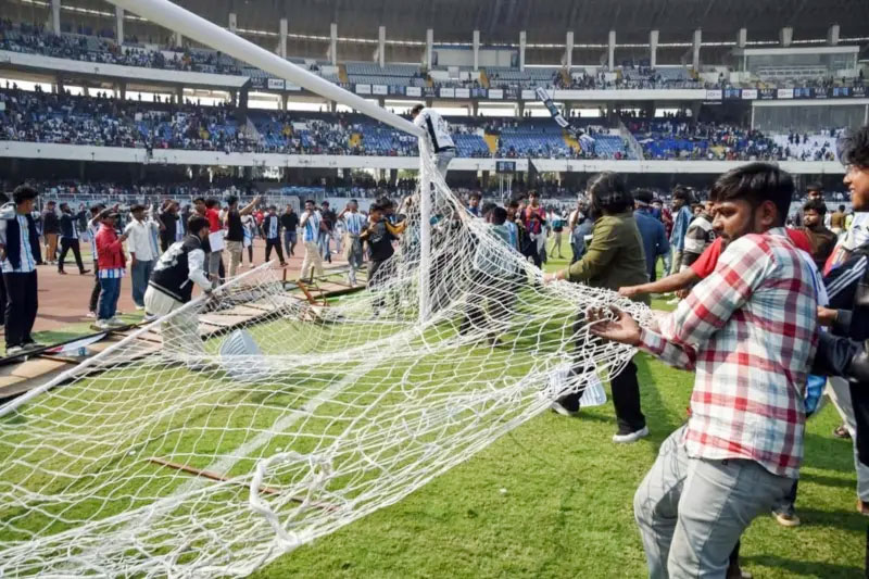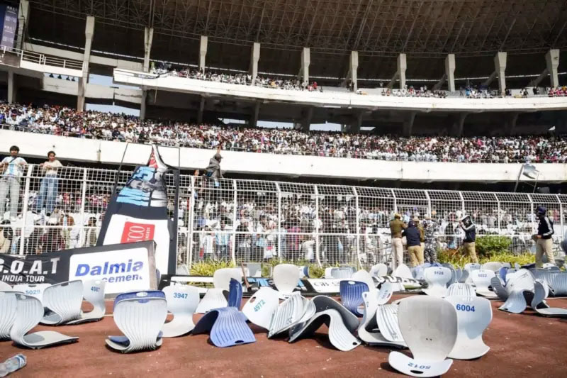 এদিকে লিওনেল মেসি সময়ের আগে স্টেডিয়াম ছেড়ে চলে যাওয়ায় মাঠ ও গ্যালারি জুড়ে চরম বিশৃঙ্খলা দেখা দেয়। আসন ভাংচুর করা হয়, টার্ফ নষ্ট করা হয়। মাঠে নেমে আসেন ক্ষুব্ধ দর্শকদের একাংশ।