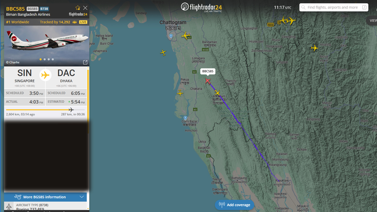 ফ্লাইটরাডারের লাইভ ট্র্যাকিংয়ে দেখা গেছে বিমান বাংলাদেশ এয়ারলাইন্সের বিজি৫৮৫ ফ্লাইটটি বাংলাদেশের আকাশসীমায় প্রবেশের পর বঙ্গোপসাগরের ওপর অবস্থান করছেন।