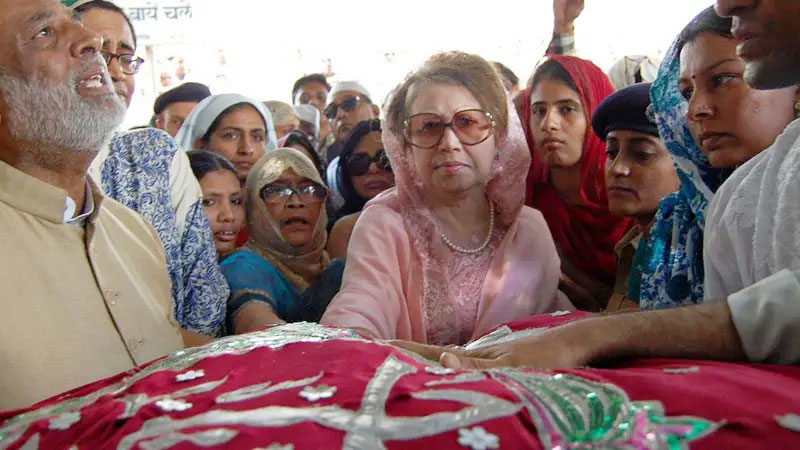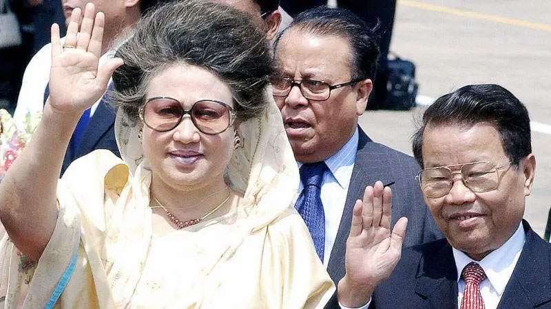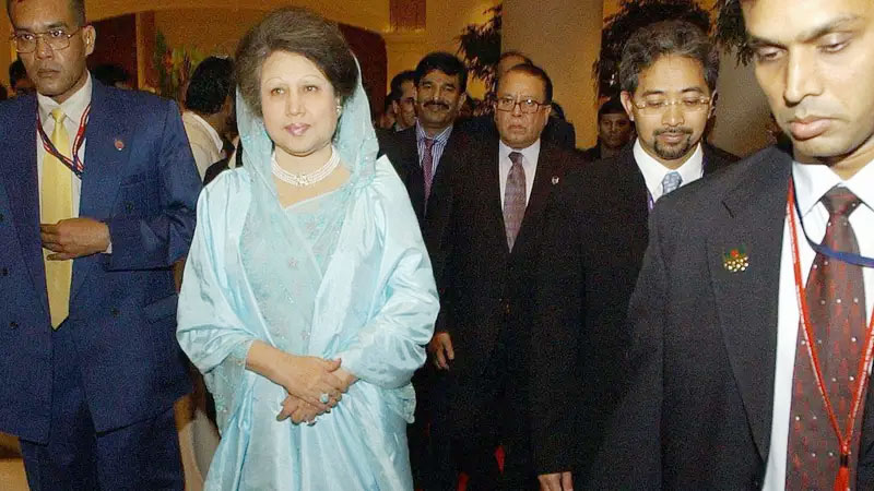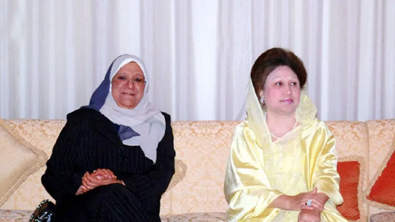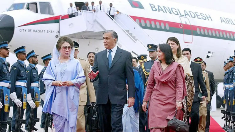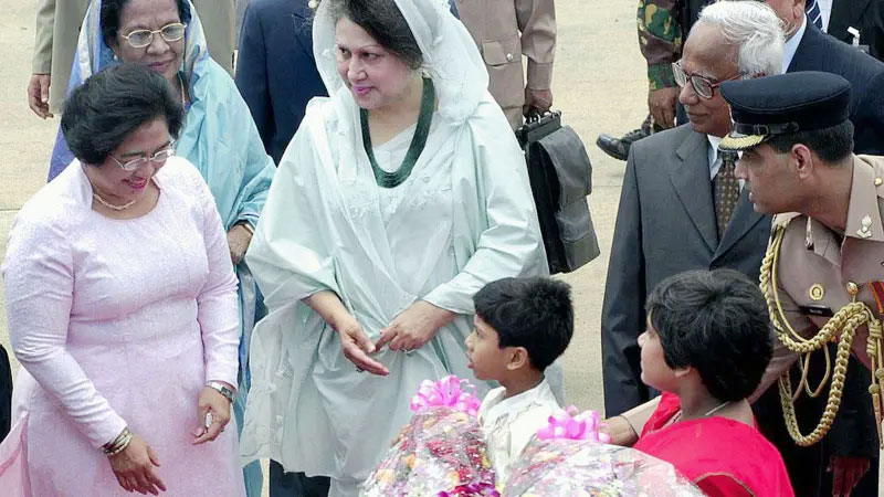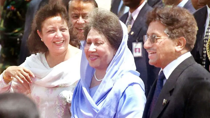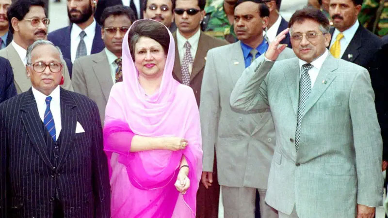 ২০০২ সালের ৩১শে জুলাই ঢাকার তৎকালীন জিয়া আন্তর্জাতিক বিমানবন্দরে এক বিদায়ী অনুষ্ঠানে পাকিস্তানের রাষ্ট্রপতি পারভেজ মোশাররফের সাথে বাংলাদেশের প্রধানমন্ত্রী খালেদা জিয়া। পাশে হাসছেন মোশাররফের স্ত্রী সেহবা।