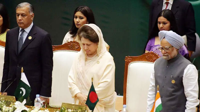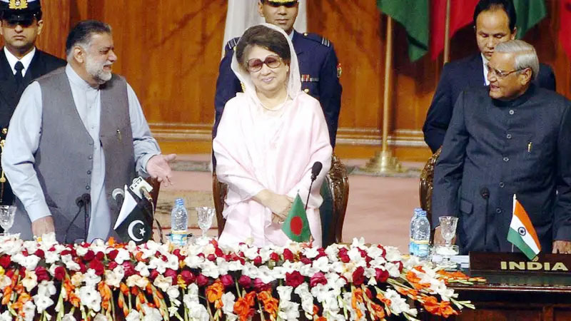 ২০০৪ সালের ছয়ই জানুয়ারি পাকিস্তানের ইসলামাবাদে ১২তম দক্ষিণ এশীয় আঞ্চলিক সহযোগিতা সংস্থা (সার্ক) শীর্ষ সম্মেলনের সমাপনী অনুষ্ঠানে ভারতের প্রধানমন্ত্রী অটল বিহারী বাজপেয়ী (ডানে), পাকিস্তানের প্রধানমন্ত্রী জাফরুল্লাহ জামালির (বামে) সাথে বাংলাদেশের তৎকালীন প্রধানমন্ত্রী খালেদা জিয়া।