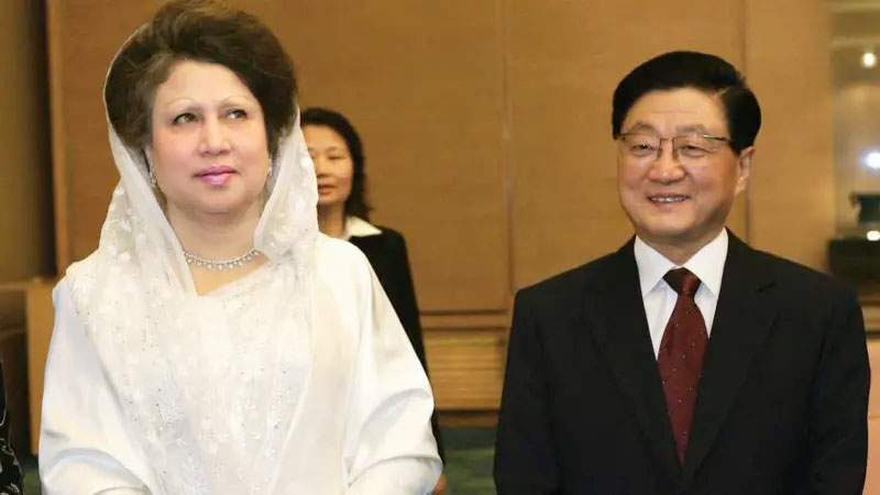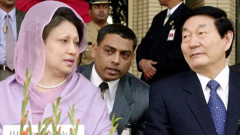 চীনের উপ-প্রধানমন্ত্রী হুয়াং জু'র সাথে বাংলাদেশের প্রধানমন্ত্রী খালেদা জিয়া। ২০০৫ সালের ১৭ই অগাস্ট বেইজিংয়ে বৈঠকের আগে ছবিটি তোলা হয়।